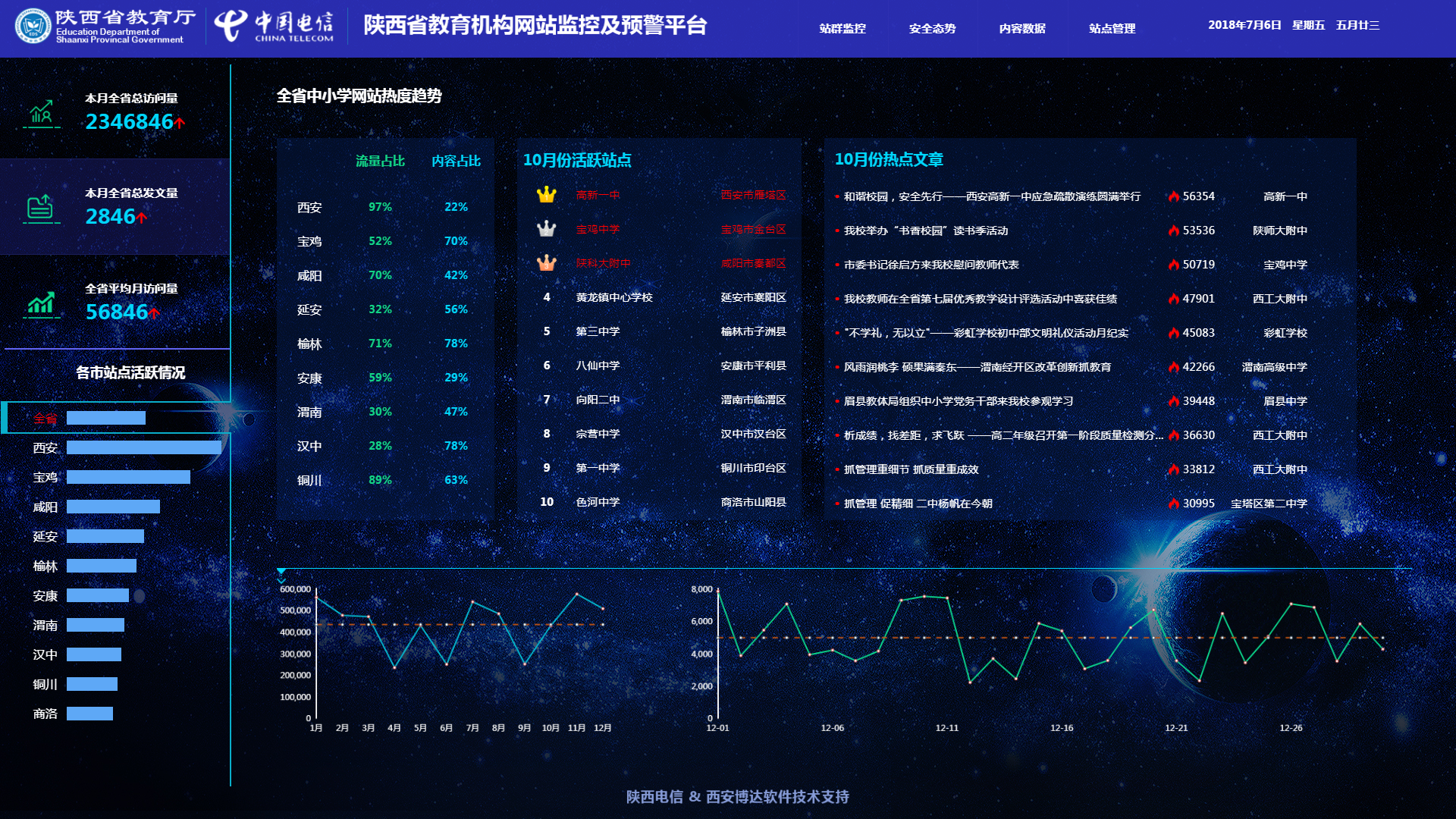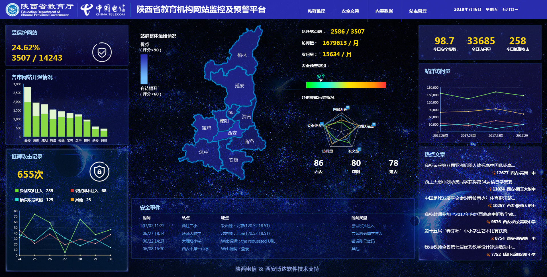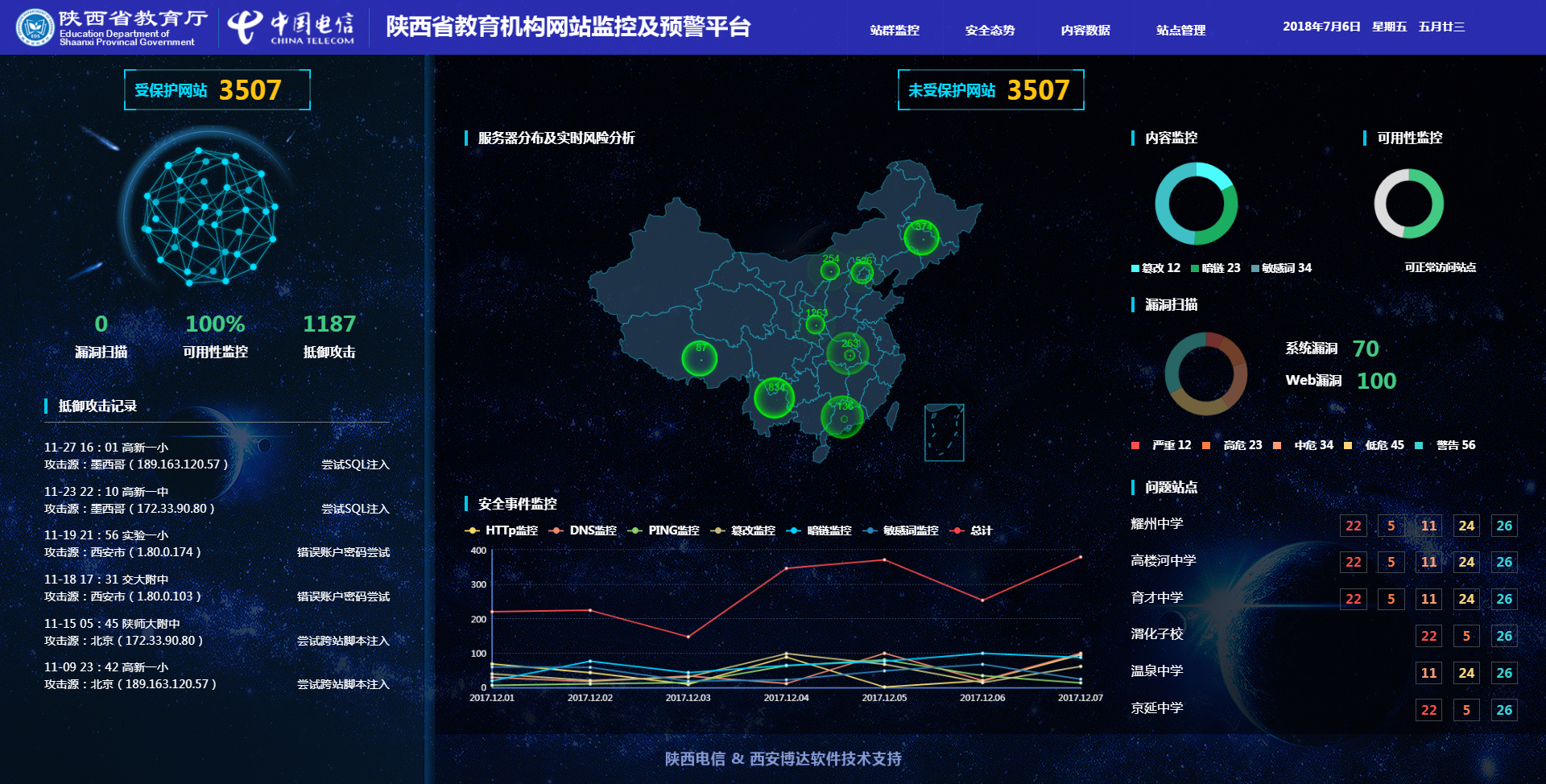 博达软件联手中国电信,为陕西省教育厅部署统一的校园网站监控及预警平台,将全陕西省近840个学校站点,进行统一收录,实现了对全陕西省的高等院校、中小学网站的全面监控和预警,并且,平台集成了入侵防护日志统计、全省攻击范围对应地图位置显示以及对与每日监控类型的多图标统计分析等功能,全面的解决了全省近千家教育机构网站无法统一监控与维护的难题。