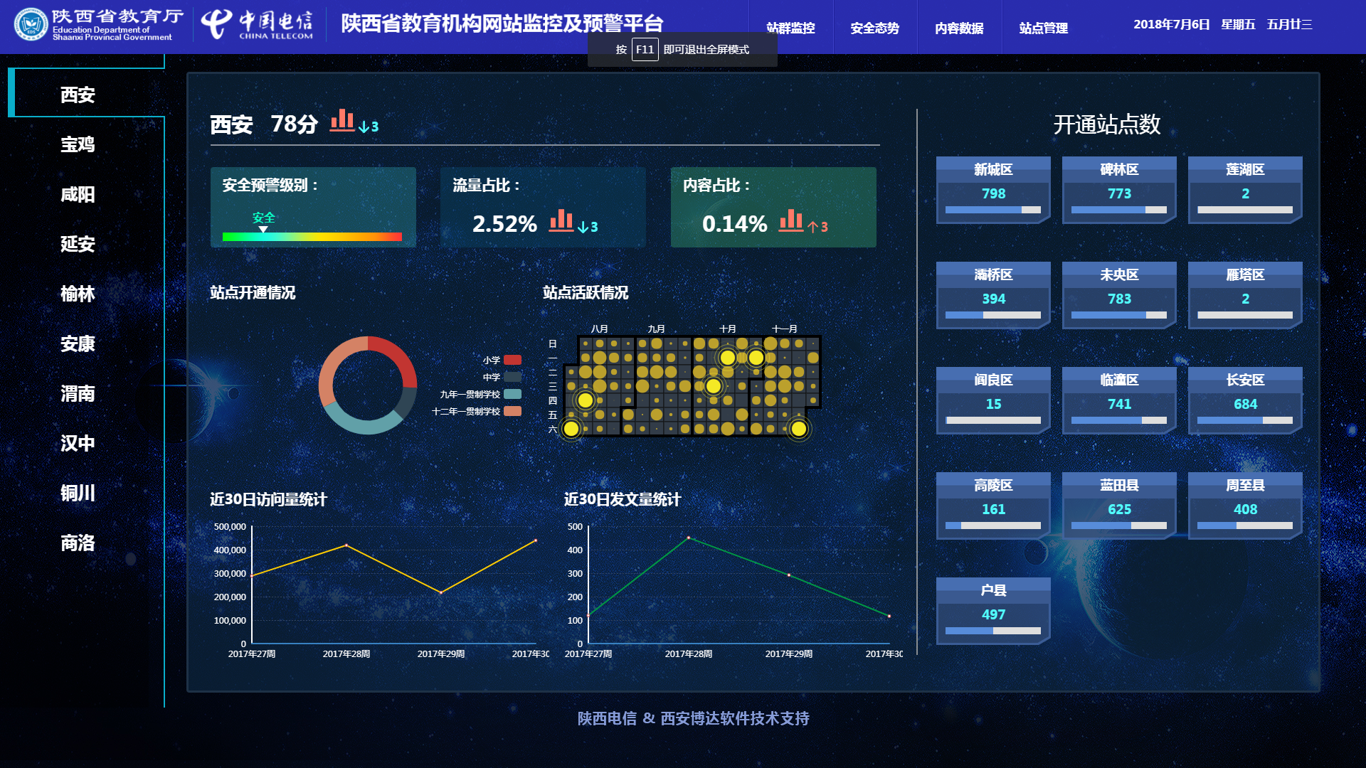 由博达提供技术支持的陕西省教育机构网站监控及预警平台,帮助陕西省教育厅第一次全面统计出全陕西省教育机构网站的入侵防护数据,并能做到及时预警,可通知监控范围内所有学校及时做好网站防护措施,使得陕西省教育厅及其下的数百家教育机构,能及时全面了解网站运维状况,做到事先预警,及时防控。