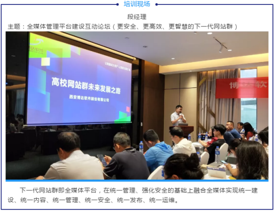 在后续的工作中,博达软件将继续提高服务能力和服务水平,持续为高校网站群建设、运营的发展创新赋能,将博达培训班的项目长期进行下去,力求在促进高校网站群建设发展道路上开阔一片天地。