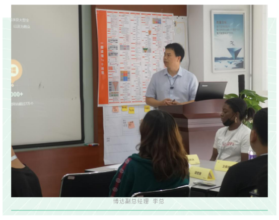 下午正式开启系列培训课程的学习。首先,开场培训是由博达软件副总经理李总为大家分享《走进博达》。李总从发展历程、业务流程、产品矩阵几个方面深入浅出介绍了博达,现场提问学生们踊跃发言,积极参与课程内容的学习。