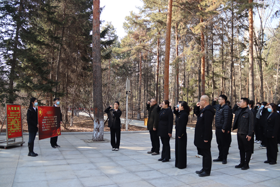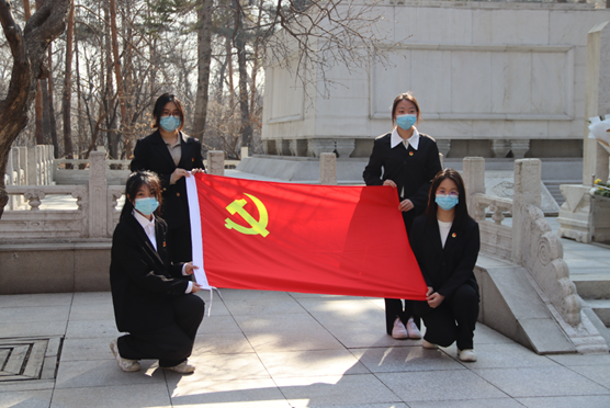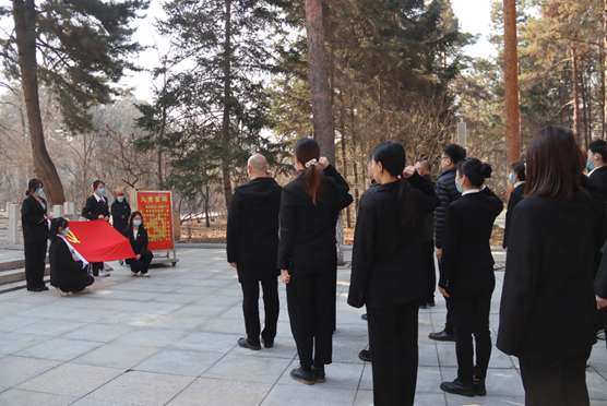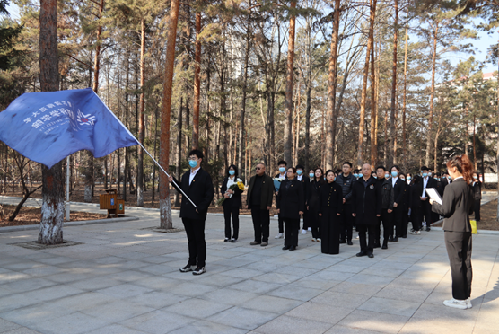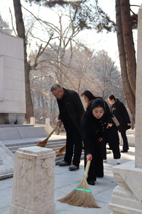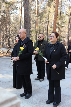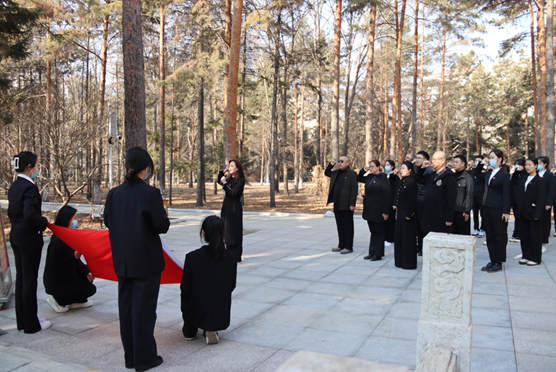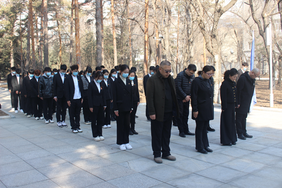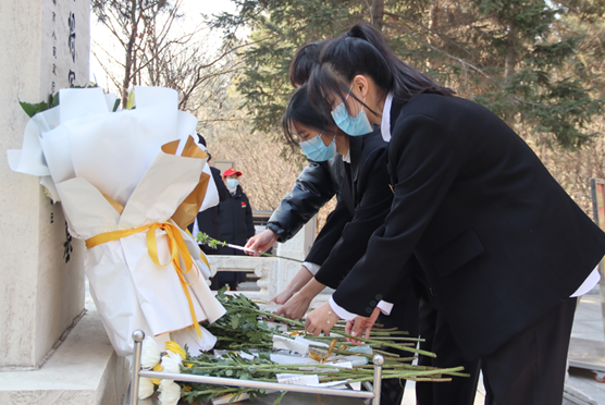 学院领导、老师为烈士们祭扫墓碑,并带领学生们有序地献出手中鲜花,向烈士默哀,全员肃立鞠躬。一鞠躬,敬的是先烈们一腔热血长眠于此;二鞠躬,敬的是祖国盛世繁华依旧;三鞠躬,敬的是中华民族国泰民安!