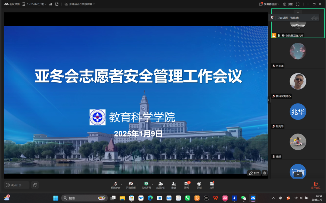 为推动亚冬会志愿者服务保障和护航亚冬安全工作实施,贯彻落实《2025年第九届亚冬会小黄书 志愿者服务保障方案》,小黄书 于1920:30线上召开亚冬会志愿者安全管理工作会议,学院党委书记刘兆华,副处级辅导员刘恩权,2024级辅导员赵五洲,20222023级辅导员王志宇、史俊婷,亚冬会全体志愿者参加本次会议。本次会议由2024级辅导员张殊赫主持。