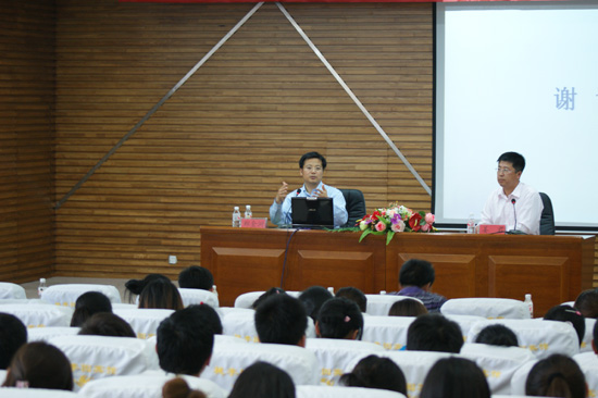 郑金洲从事教育研究多年,有着丰富的研究经验和学识。在报告中,他主要从复杂思维的引入与认识教育的新方式、教育价值观与教育的人重新定位、学校内涵发展研究与特色立校、校长领导力研究与校长专业化、教师角色转变研究与教师专业发展、课堂教学研究与课堂教学行为变革、课程改革反思与新课程推进、学校教育科研研究与科研兴校等八个方面,着重探讨了近年来教育理论研究的新进展引发的基础教育改革,详细阐述了自己的观点以及研究成果。他以风趣的语言和鲜活的事例为在座师生提供了一场丰盛的学术盛宴,使得每一位听众从他身上学到了课本上难以学到的知识。