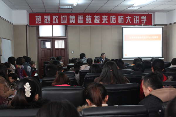 11月30日,应学院邀请,台湾中央大学黄藿教授在社科楼213会议室做了题为《亚理斯多德实践哲学与公民德育》的学术讲座,学院教师、博硕研究生100多人听取了讲座。讲座由院长温恒福教授主持。