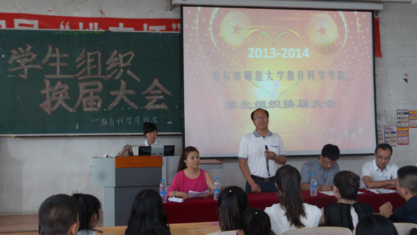 在社科楼652教室隆重举办院团委学生会、学生团总支、社团联合会、学生宿舍管理委员会学生干部换届大会。学院党委书记辛显文、副书记魏衍军、学院辅导员老师及学院新老两届学生干部应邀出席本次大会。