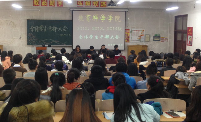 (周佳妮/文)2014年11月19日下午三点,学院在社科楼629教室开展了全体学生干部理论学习活动,学院党委副书记魏衍军以及三位辅导员老师出席活动,2012、2013、2014级全体学生干部参加。
