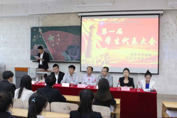 第一届学生代表大会于6月3日在社科楼223教室隆重召开。出席大会的有学院党委书记辛显文、学院党委副书记魏衍军、团委书记范晓丹、学工办主任白永、校学生会副主席李毅聪以及全体学生代表。会议由2012级团总支书记袁鸣梓同学主持。