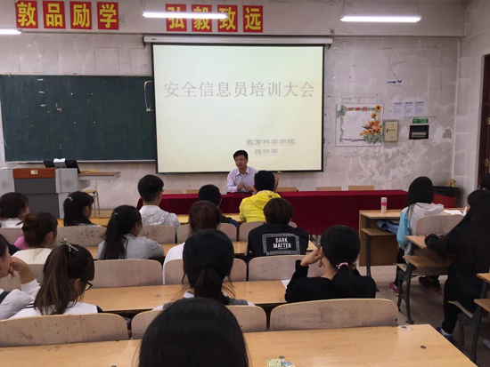 (王聪/文)为加强学院安全管理工作,进一步规范学生安全信息报送的内容和程序,畅通反馈渠道,明确相关责任,确保能够及时准确地掌握和有效处理学生安全问题,9月21日下午,学院在社科楼552教室召开了2016级学生安全信息员培训大会。会议由学院党委副书记魏衍军担任主讲,2016级各寝室长作为安全信息员参与培训。