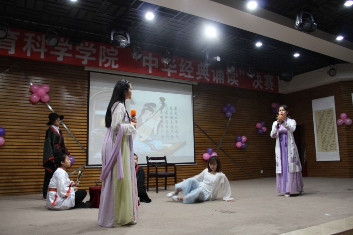 决赛由动感十足的舞蹈开场,现场气氛一片热烈。比赛过程中,各位选手通过丰富多样的形式将《凤求凰》、《蜀道难》、《琵琶行》、《荆轲刺秦》等我们耳熟能详 的中华经典进行了精彩诵读,让在场的同学们再次感受到中华经典温润人生,启迪智慧的力量;品味了中国传统文化的源远流长和博大精深。其中,比赛中场的歌曲表演和更是惊喜不断,让在场观众深深陶醉其中。