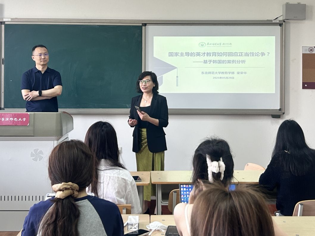 (杨靖/文)为开阔师生学术视野,深化多元学术认知,应学院邀请,东北师范大学教育学部副部长、博士生导师梁荣华教授于5月29日上午在研究生学院楼302教室作题为《国家主导的英才教育如何回应正当性论争》的学术讲座。教育学原理、比较教育学、教育史等学科的研究生听取了讲座。讲座由教育史学科负责人陈桂香教授主持。